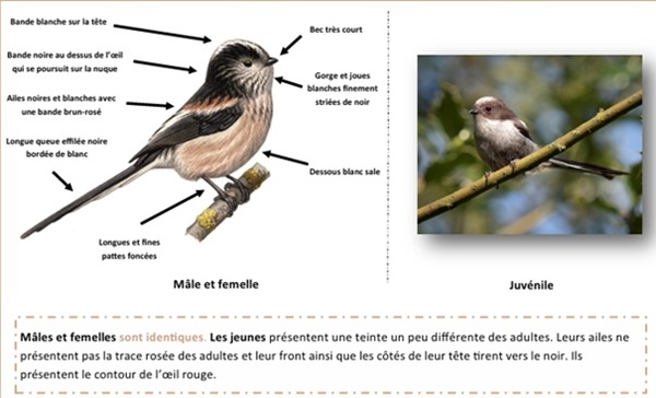Reproduction : Une à deux couvées par an, de 6 à 12 œufs blancs teintés de rose et pointillés de rouge. La première couvée entre mi-avril et mi-mai, la seconde en juin. Contrairement aux Paridés (les autres mésanges), elle ne construit pas son nid dans des cavités mais dans un endroit dégagé. Elle construit de toute pièces sa propre cavité dans un arbre ou un buisson. Elle se range parmi les meilleurs bâtisseurs au royaume des oiseaux et, en dépit du fait qu’elle est un des plus petits oiseaux de chez nous, elle construit un grand nid pour sa taille (environ 20 cm de longueur sur 12). La forme du nid est ovoïde (ou en forme de boule), haut de 20 cm, complètement fermé avec un petit orifice latéral dans la partie supérieure. La paroi en mousse et en lichen, avec une petite quantité de fibres végétales, le tout tenu par du fil d’araignée ; la surface est tapissée de lichens, si bien que le nid passe complètement inaperçu dans un contexte vert (lierre contre un tronc ou un mur, branche de conifère touffue, etc.). A l’intérieur il est garni de d’une incroyable quantité de petites plumes et de poils. Sa construction demande aux deux bâtisseurs 15 à 20 jours de travail. Les œufs sont couvés par la femelle seule entre 12 et 14 jours. Les petits restent au nid entre 15 et 20 jours après l’éclosion, avant de prendre leur envol. Ils restent cependant près de leurs parents et on a même constaté qu’elles les aident plus tard à nourrir les jeunes nés d’une seconde ponte.